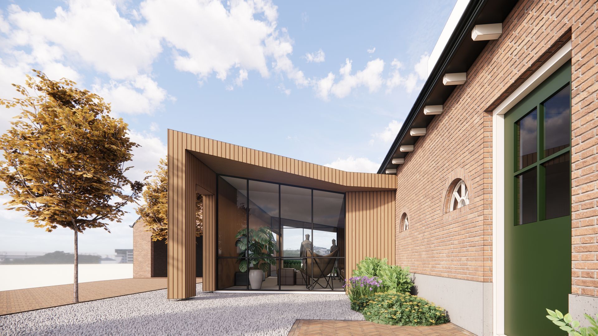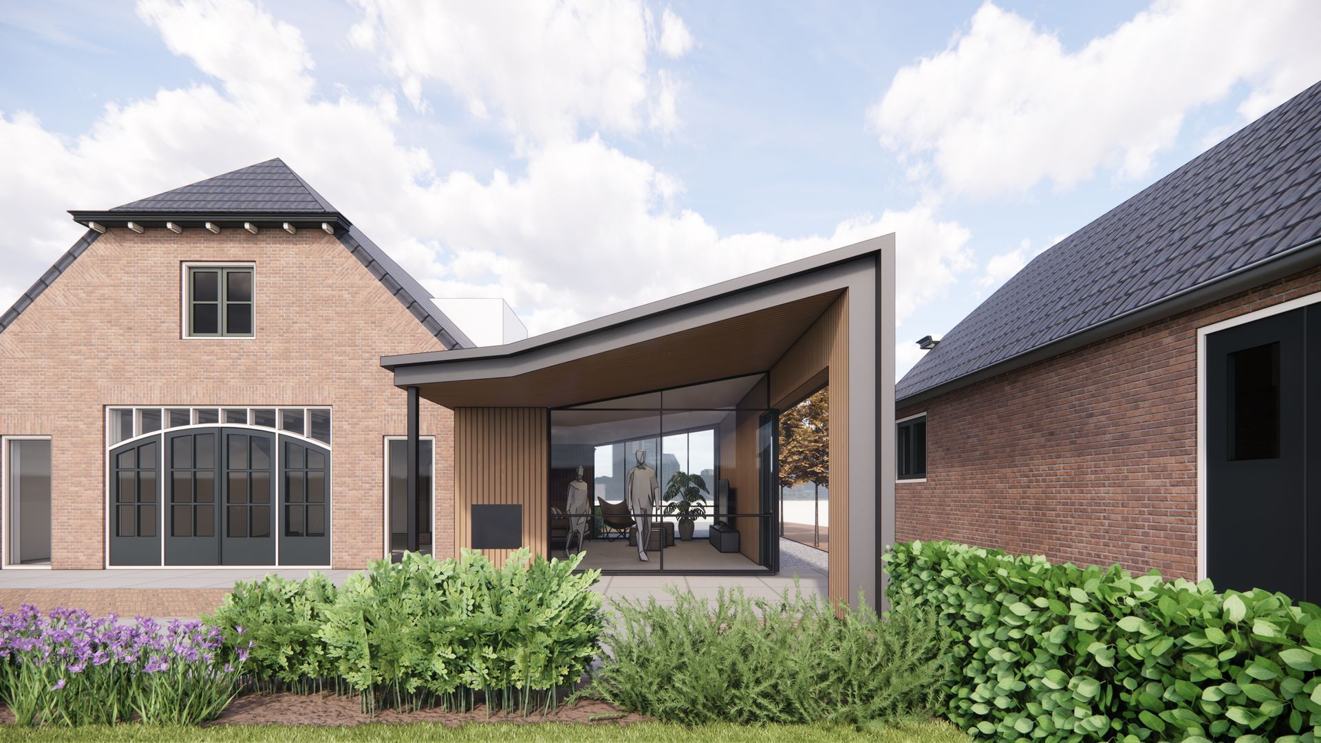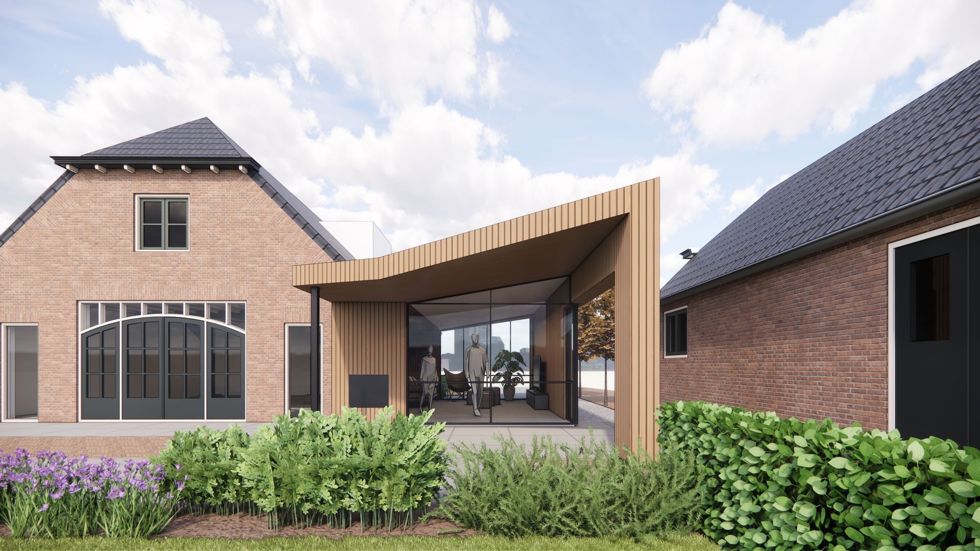 De opdrachtgever wenst een uitbreiding van de leefruimte zonder de vrij diepe woning nog langer te maken. De oplossing ligt aan de zijkant, maar de ruimte is beperkt en een nieuw volume op deze plek kan al snel 'teveel' zijn. Met een moderne vormgeving en materialisering is een subtiele en eigentijdse uitbouw ontworpen die ondergeschikt is aan het hoofdvolume, en tegelijkertijd een waardevolle toevoeging vormt op de historische boerderij. Een ander voordeel van de moderne variant ten opzichte van de meer traditionele oplossing met zadeldak is het feit dat het binnen de regels van het vergunningsvrij bouwen te realiseren is en er voor dit ontwerp geen omgevingsvergunning nodig is.